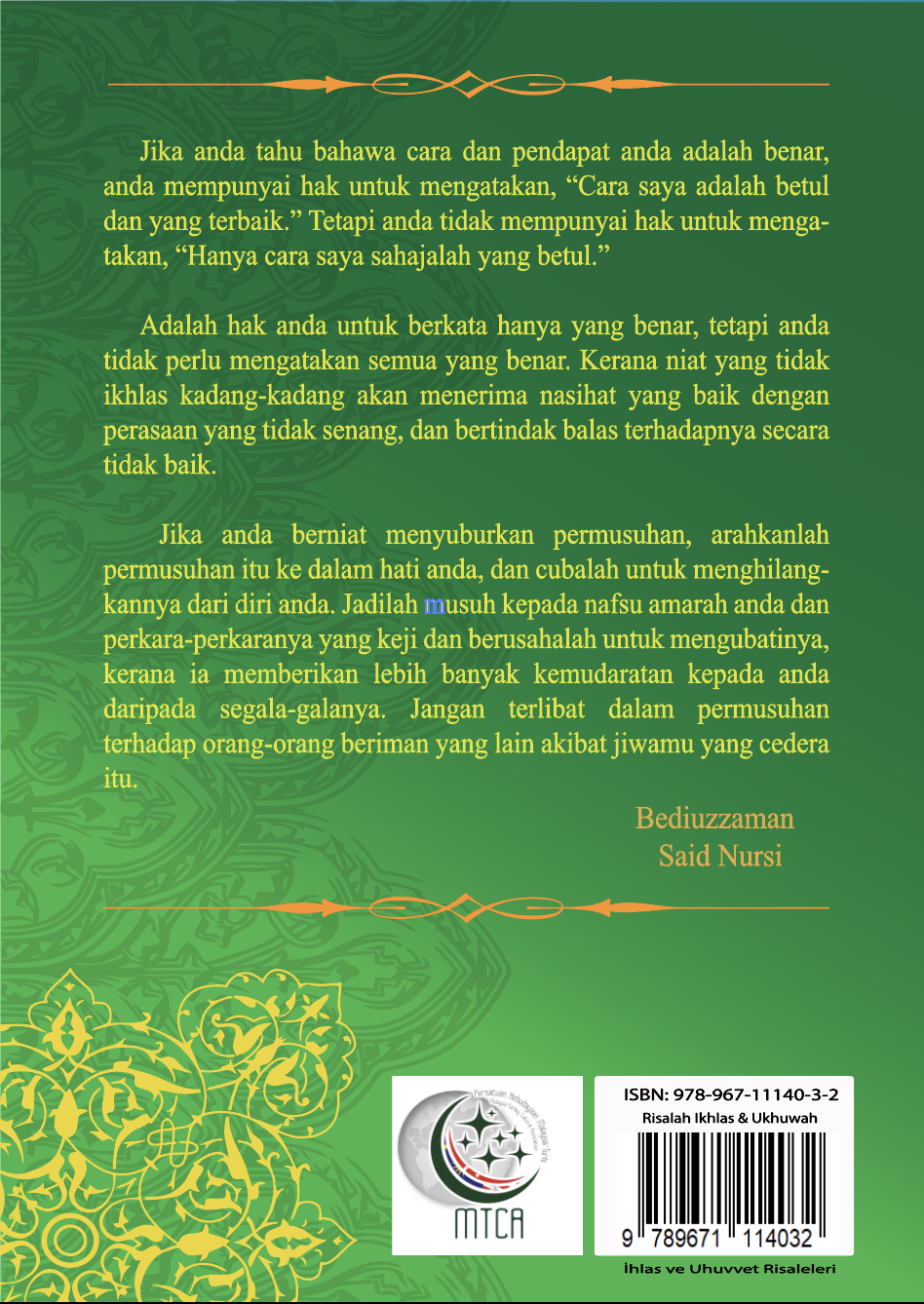The Treatise on Brotherhood, the Twenty-Second Letter, contains two main parts. The first outlines the moral and spiritual foundations for love, forgiveness, and unity among believers. It strongly condemns hostility and rancor as destructive to personal faith and communal harmony. With persuasive reasoning, it explains that enmity is unjust and harmful—not only spiritually but also socially, emotionally, and morally—proving this through both wisdom and lived human experience.